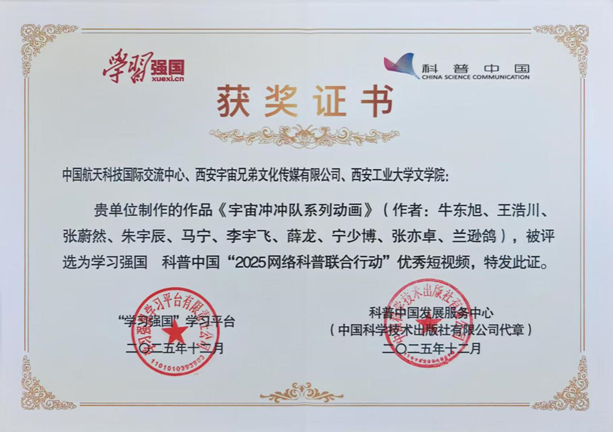 近日偷拍自慰 参与制作的《宇宙冲冲队系列动画》入选“2025网络科普联合行动”优秀短视频。该作品由中国航天科技国际交流中心、西安宇宙兄弟文化传媒有限公司与偷拍自慰 完成。