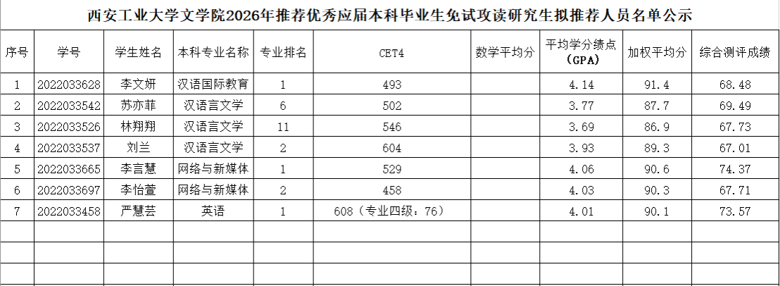 偷拍自慰 2026年推荐优秀应届本科毕业生免试攻读研究生拟推荐人员名单公示