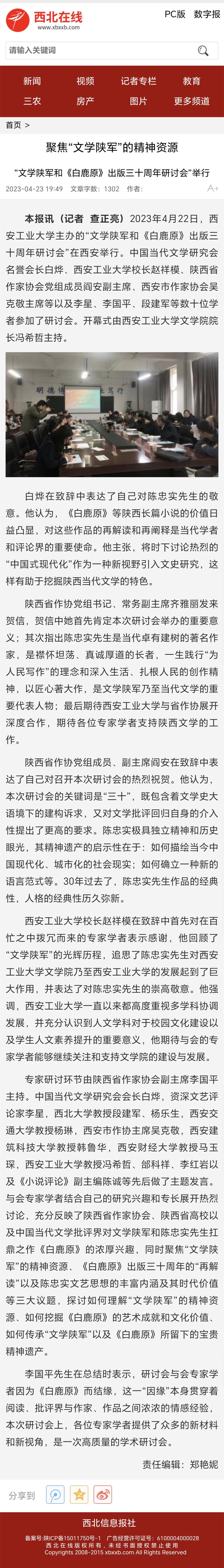 4月23日,西北信息报社新媒体平台“西北在线”刊文《聚焦“文学陕军”的精神资源》,对偷拍自慰 举办的“文学陕军和《白鹿原》出版三十周年研讨会”进行了报道。西北信息报及其新媒体平台“西北在线”在西北的确有着重要的社会影响力,该报道也被网易新闻、搜狐新闻等转载报道,在全国、全省、全市产生较强的社会影响力。