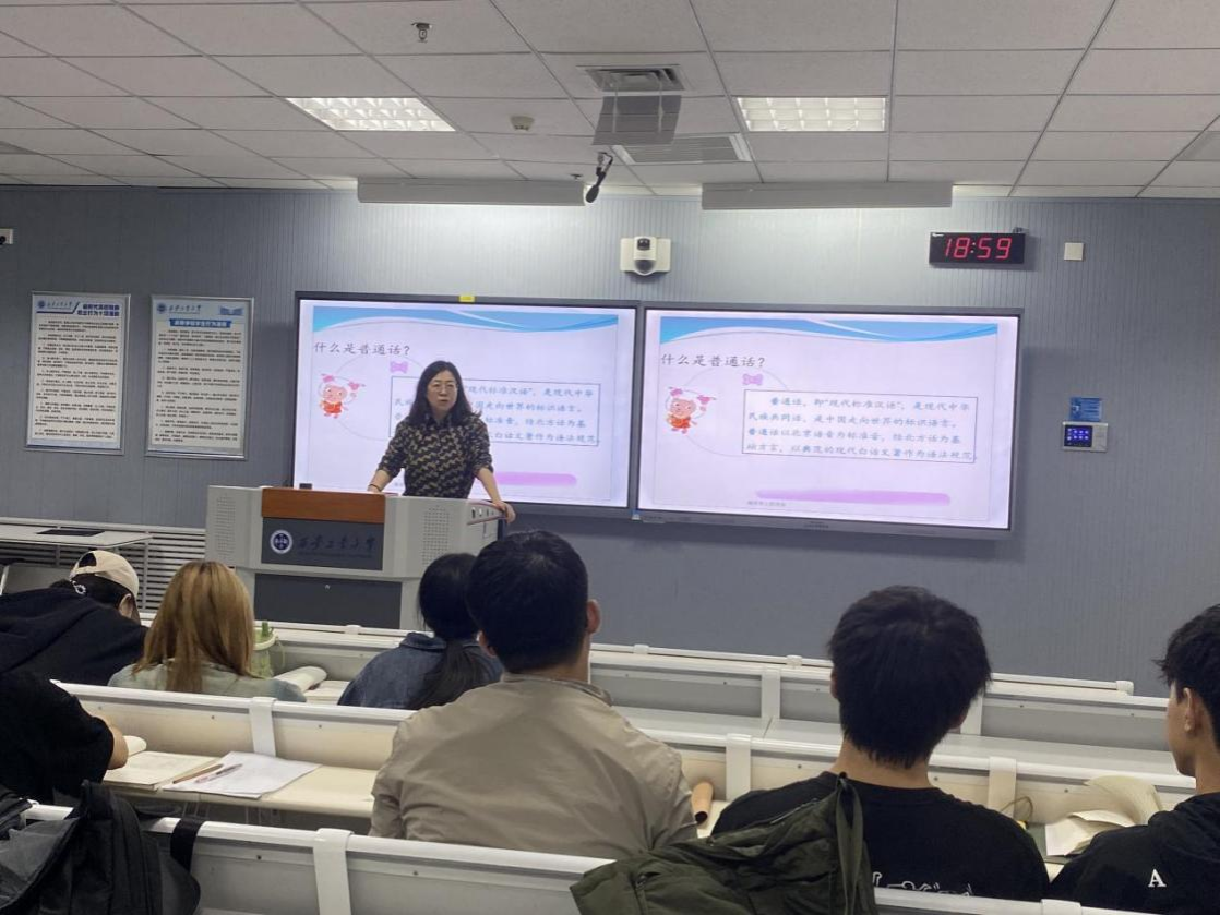 课堂上,学生们反响热烈。汉语言文学专业的少数民族学生旦增仁旦说:“老师对比分析了我的母语与普通话在语法结构上的异同,让我更深刻理解了国家通用语言文字对各民族交流的重要性。”汉语国际教育专业学生马鑫说:“通过《汉语发展史》微课,我终于明白普通话不是‘凭空出现’的,它是汉语几千年演变的精华,以后向留学生讲解时更有底气了。”英语专业学生陈晓敏分享道:“之前准备模拟国际学术会议发言时,总觉得英文表达不顺畅,听完微课才发现,是自己先用方言化口语组织了思路,转译时自然容易出错。现在我会先以规范普通话梳理观点,再进行英文翻译,逻辑清晰多了。”网络与新媒体专业学生韩卓言说:“做校园科普短视频时,用网络俚语没人看。听课后改用普通话讲‘垃圾分类的 3 个关键步骤’,播放量翻 1.5 倍,评论说‘清晰好懂’,终于明白规范语言才是传播力关键。”同学们还通过课堂反馈表提出建议,希望将微课内容制作成短视频在校园平台分享。