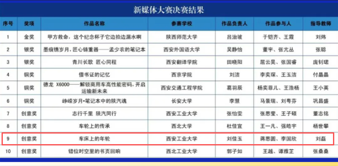 刘磊老师指导、刘佳玉、蒋思圆、李国欣同学创作的新媒体作品《车床上的年轮》脱颖而出,荣获新媒体大赛“创意奖”。