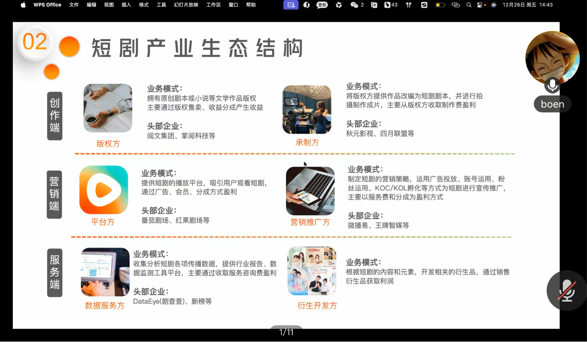 2026年1月20日,研究院资深内容创作者牛雨昊做了题为《短剧剧本分析与创作》的讲座。他围绕商业剧本的特性、短剧剧本的特殊特征、短剧行业剧本类型分析以及短剧剧本创作课题四个板块展开。他指出创作需兼顾场地、道具等客观条件,适配文化产业流水线的制作需求;他强调剧本的真实受众是制作团队,要实现文学语言到视听语言的转化;针对竖屏短剧的特殊性,他提出需用精准镜头语言与对话弥补信息局限,并通过受众画像分析,打造快节奏、强爽感的单线叙事剧情。他还以《小镇茶香恋习作》为例,拆解了短剧剧本在情节铺陈、节奏把控与本土化元素融合上的创作思路与实操技巧。