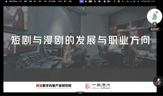 2025年12月26日,研究院短剧运营中心负责人谢博做了题为《短剧漫剧行业发展与职业方向》的讲座。他梳理了短剧发展的五个阶段,重点介绍了短剧产业生态结构、短剧漫剧的行业发展。他指出,漫剧以Z世代为核心用户,AI技术驱动产能与播放量爆发式增长,行业发展潜力巨大。最后他介绍了陕西西咸新区十里沣河影视基地,并表示期待大家到该基地开展实习实践活动。