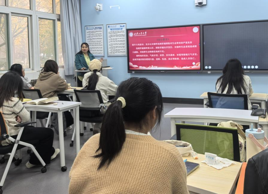 在各年级召开的“非法穿越秦岭危害警示”专题大会上,学工办主任李聪首先领学了《陕西省秦岭生态环境保护条例》及《西安市秦岭生态环境保护条例》等相关法律法规,重点解读了“禁止在秦岭核心保护区开展违规穿越、探险活动”的条款内容,阐明非法穿越行为的违法性与严重性,引导学生自觉遵法守法。