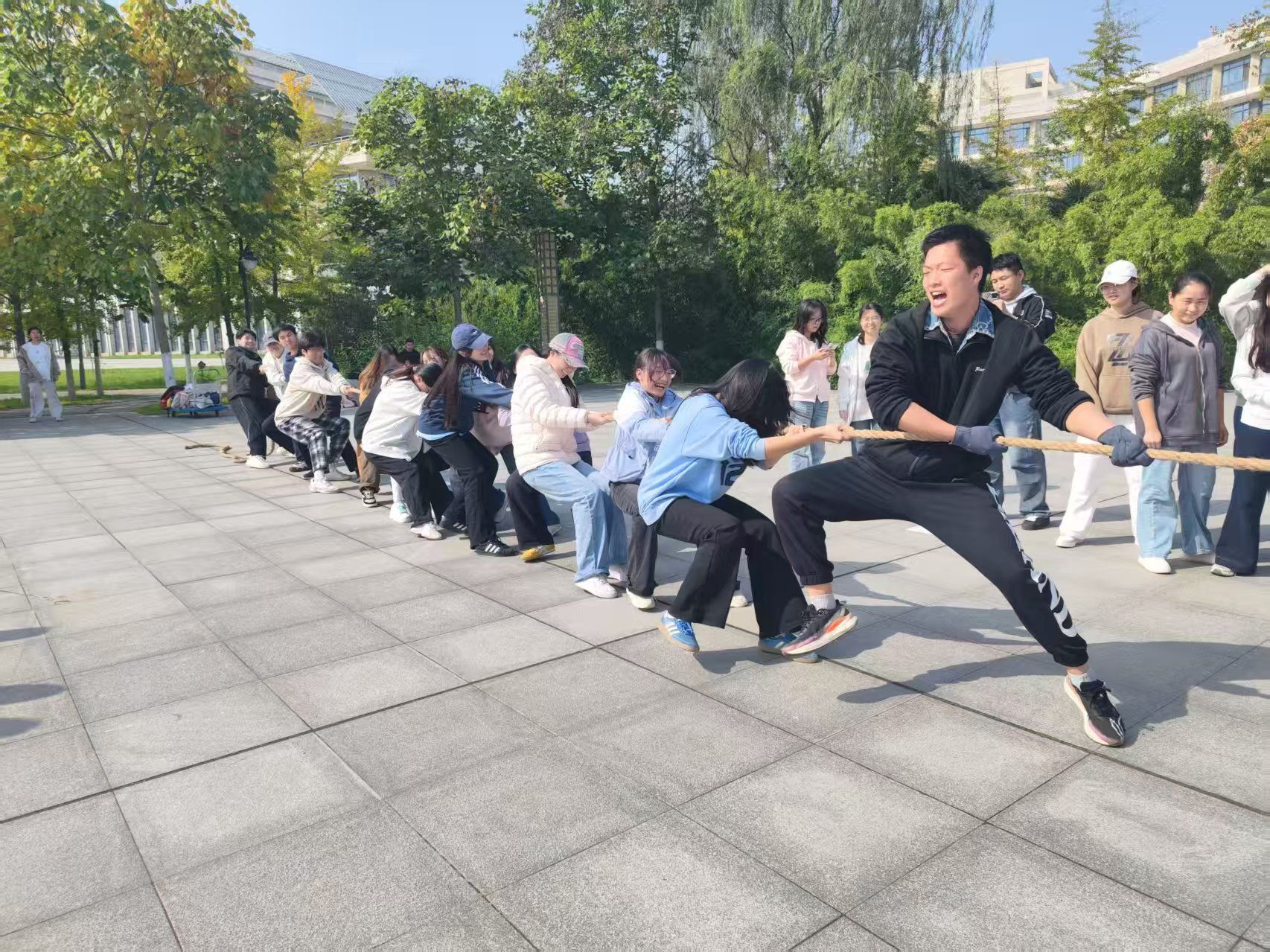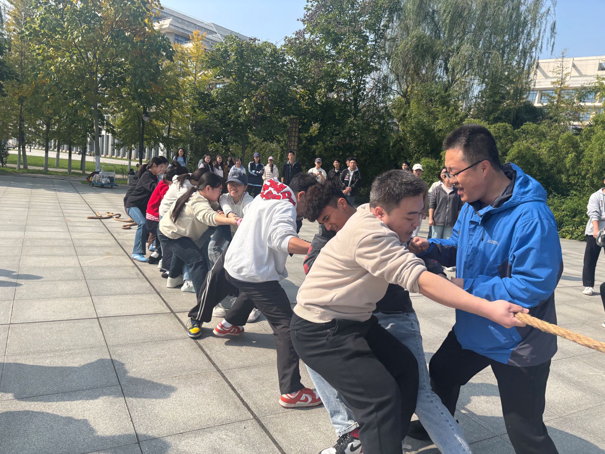 10月28日,运动会首项赛事—拔河比赛在博苑广场拉开帷幕。本次拔河赛事分为本科生6队与研究生1队,共7支队伍同台竞技。同学们手握长绳、脚蹬地面,随着裁判哨声响起,双方队员瞬间凝神发力,在“加油”呐喊声中展开力量与默契的较量,轻松欢快的氛围瞬间点燃全场,完美诠释了团结协作的体育精神。