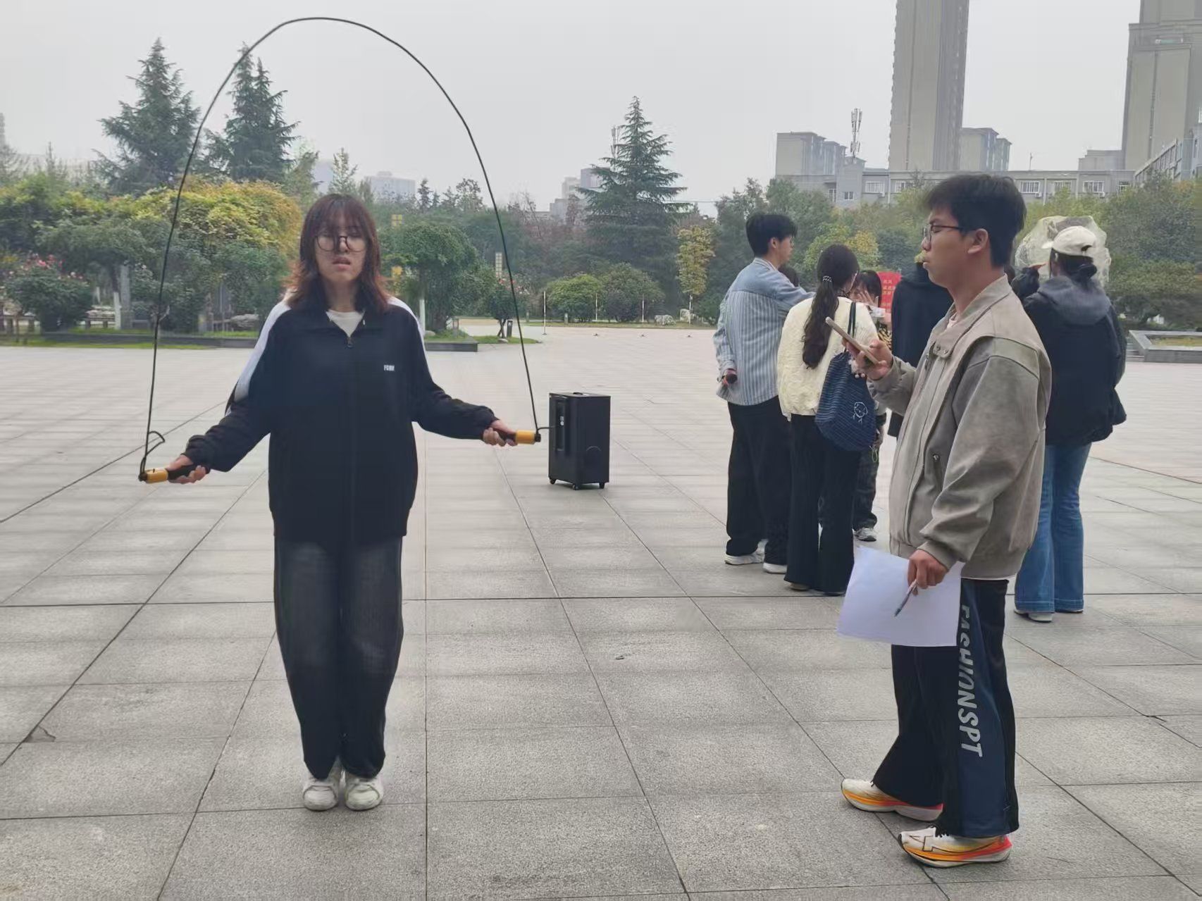 10月29日,小广场继续成为运动主场,迎面穿梭接力与女子组一分钟跳绳两项赛事接续上演。在15人×50米迎面穿梭接力赛中,各队队员默契配合,从起跑、递棒到冲刺,每一个环节都凝聚着团队的协作与速度;女子组一分钟跳绳赛场则尽显灵动,参赛学子手握跳绳、节奏明快,在计时器的滴答声中奋力跳跃,用轻盈的身姿展现着青春的活力,绳若银旋,人犹燕矫,引来现场阵阵喝彩。